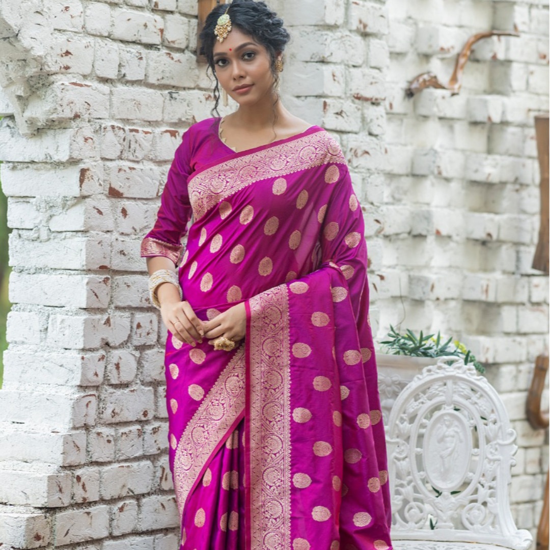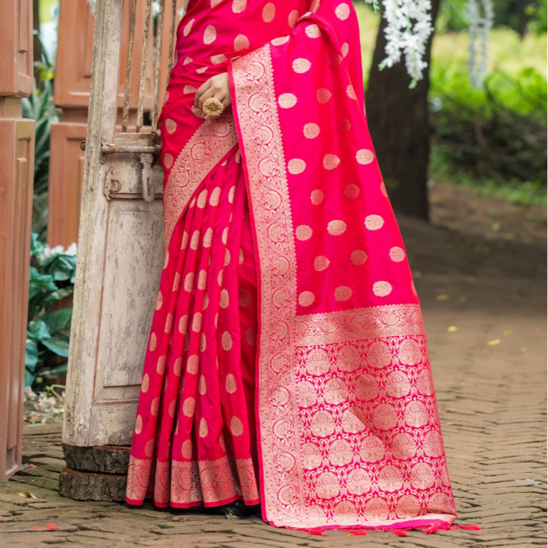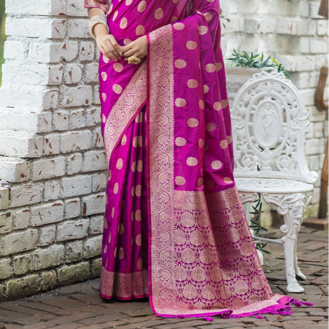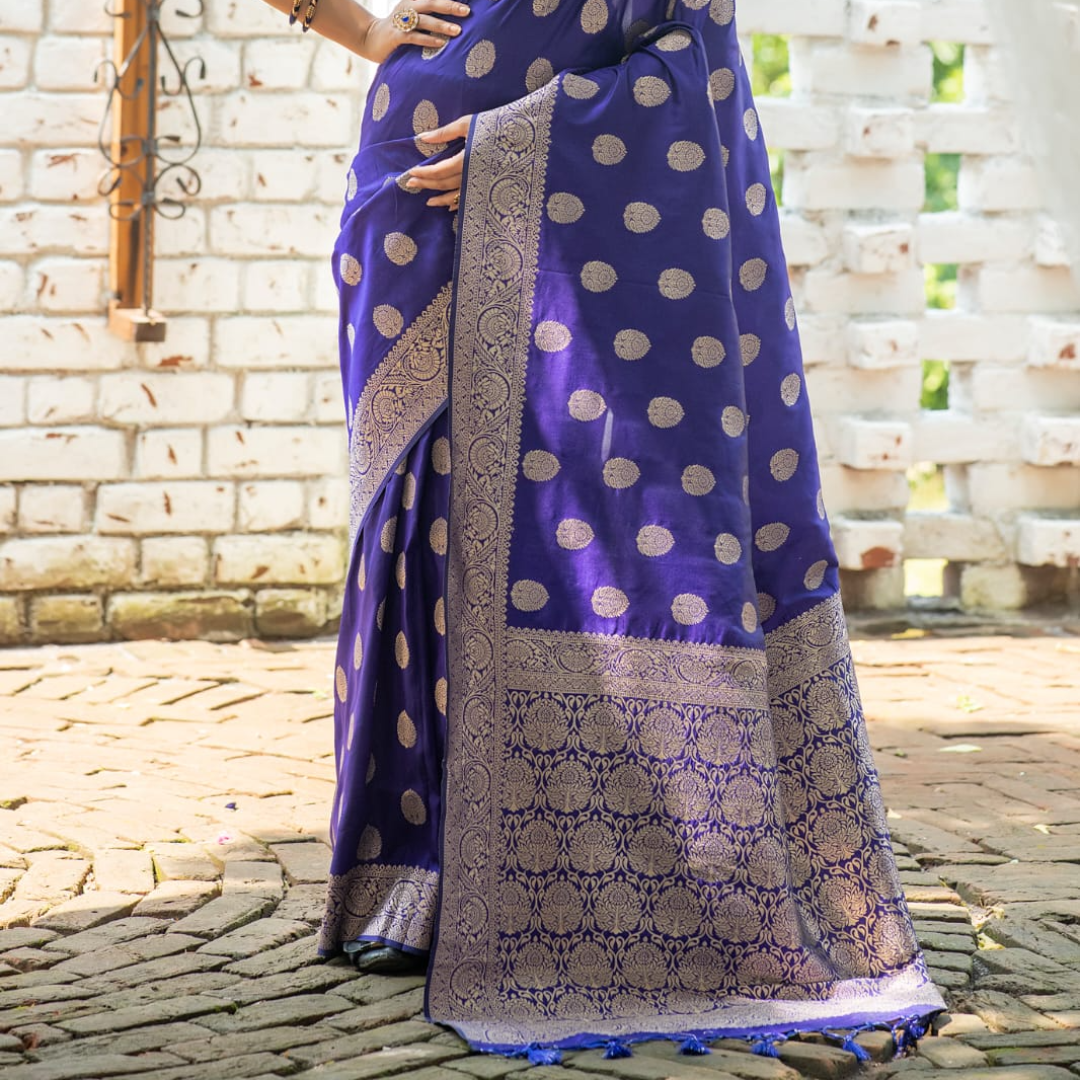 Soft banarasi katan silk saree with pure zari Weaves all over with gorgeous weaving pallu and border with fancy tassels and matching blouse piece