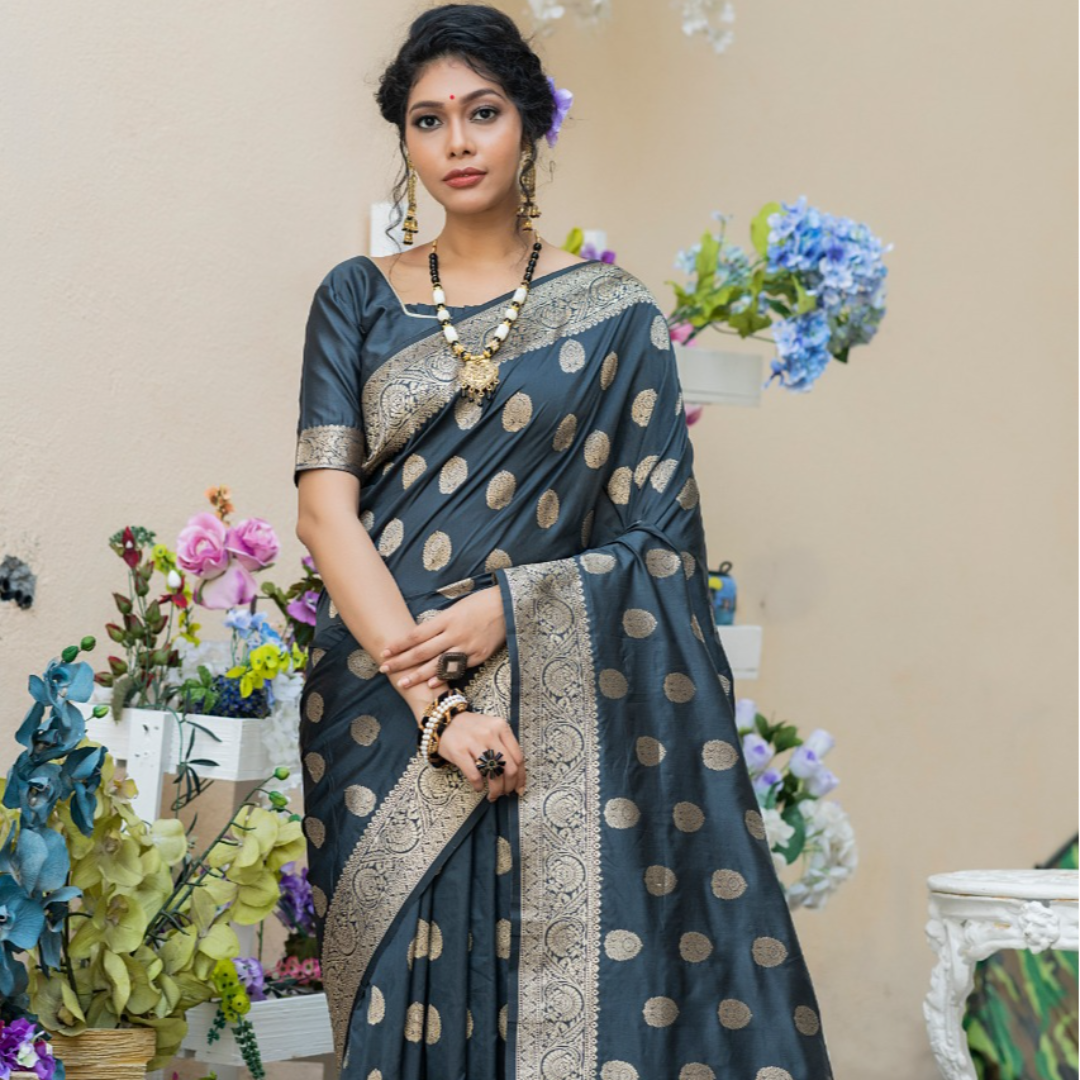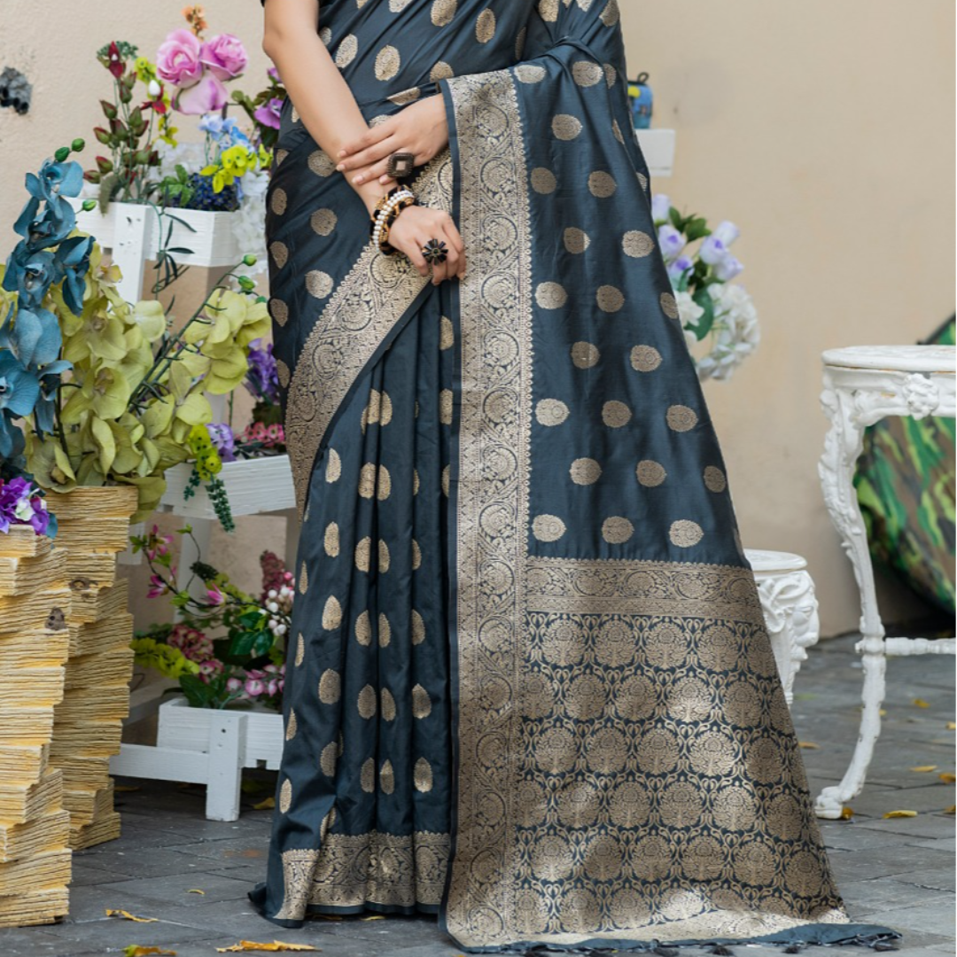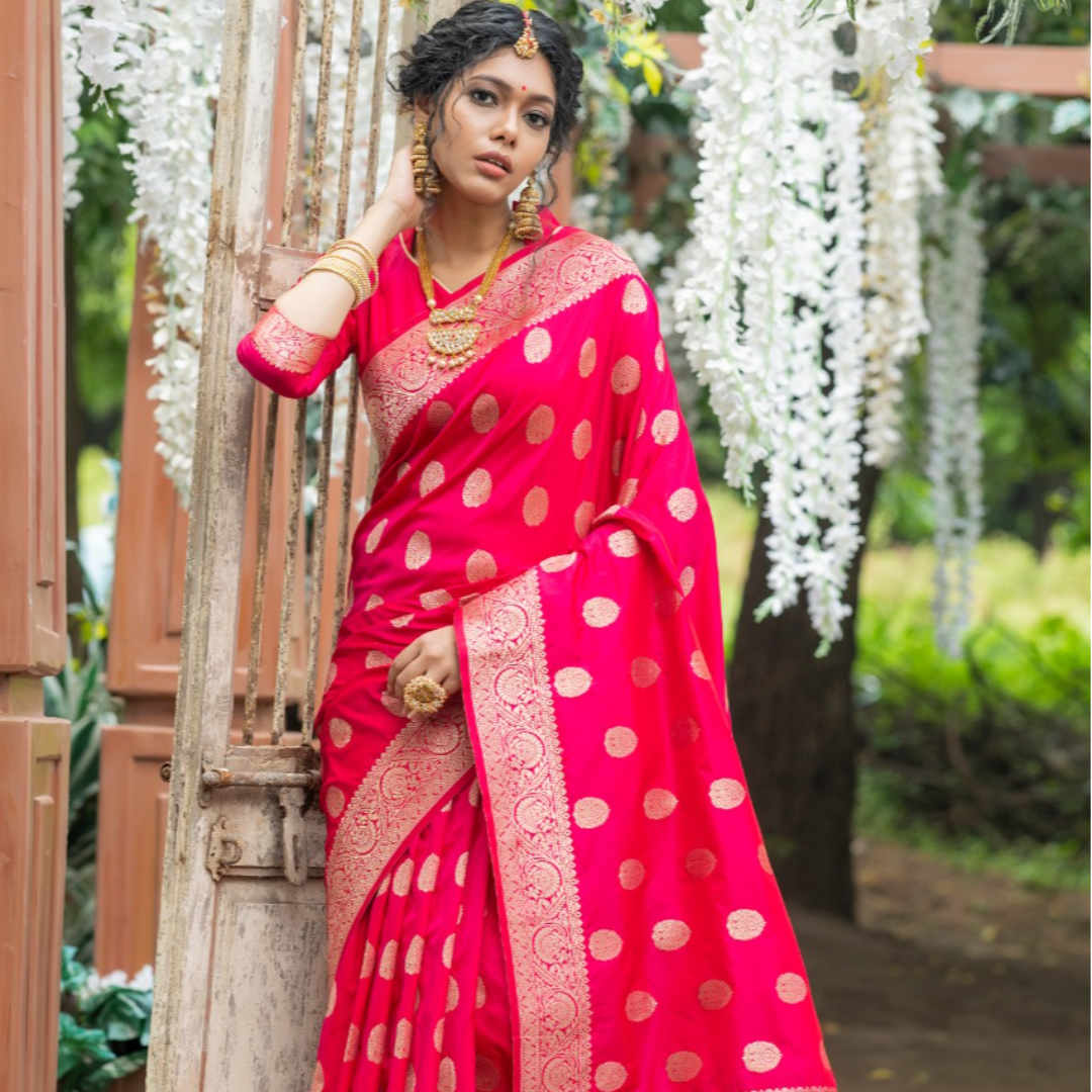 Soft banarasi katan silk saree with pure zari Weaves all over with gorgeous weaving pallu and border with fancy tassels and matching blouse piece