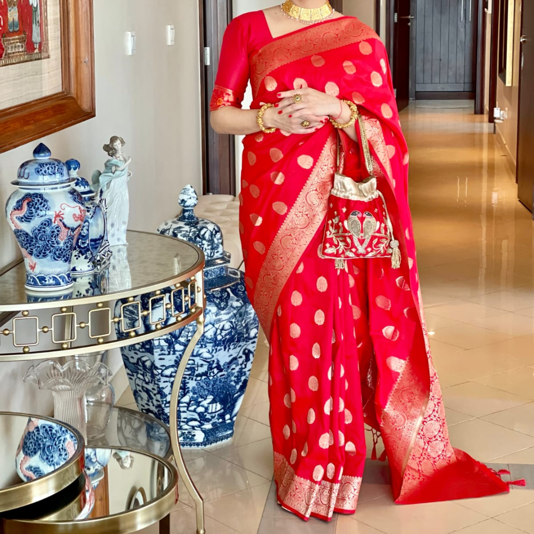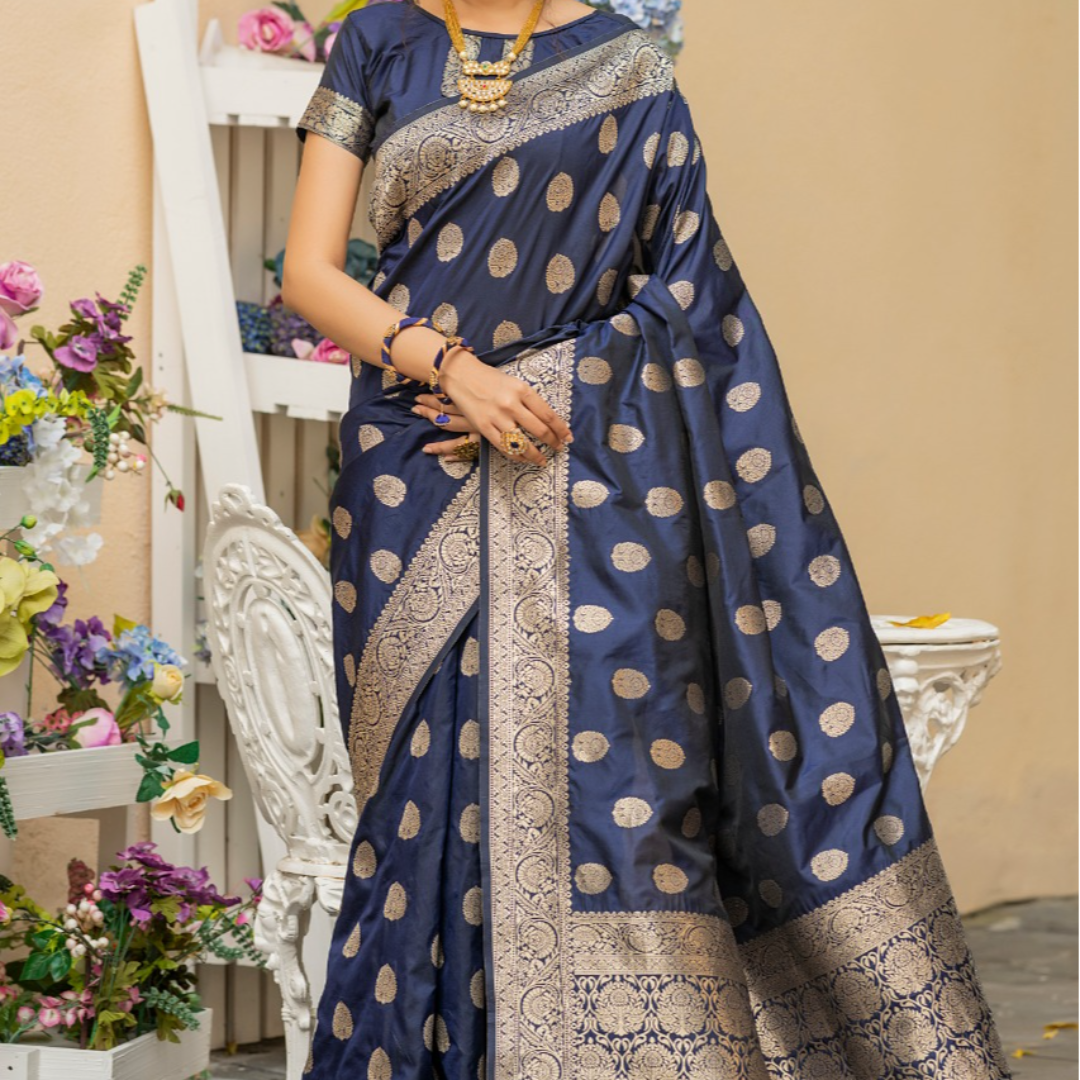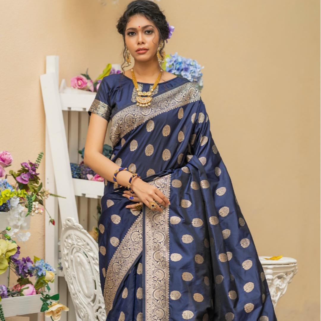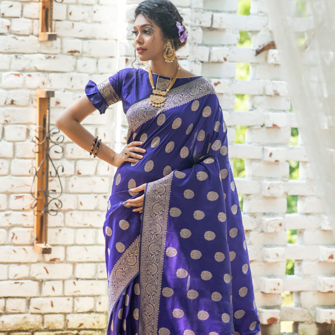 Soft banarasi katan silk saree with pure zari Weaves all over with gorgeous weaving pallu and border with fancy tassels and matching blouse piece