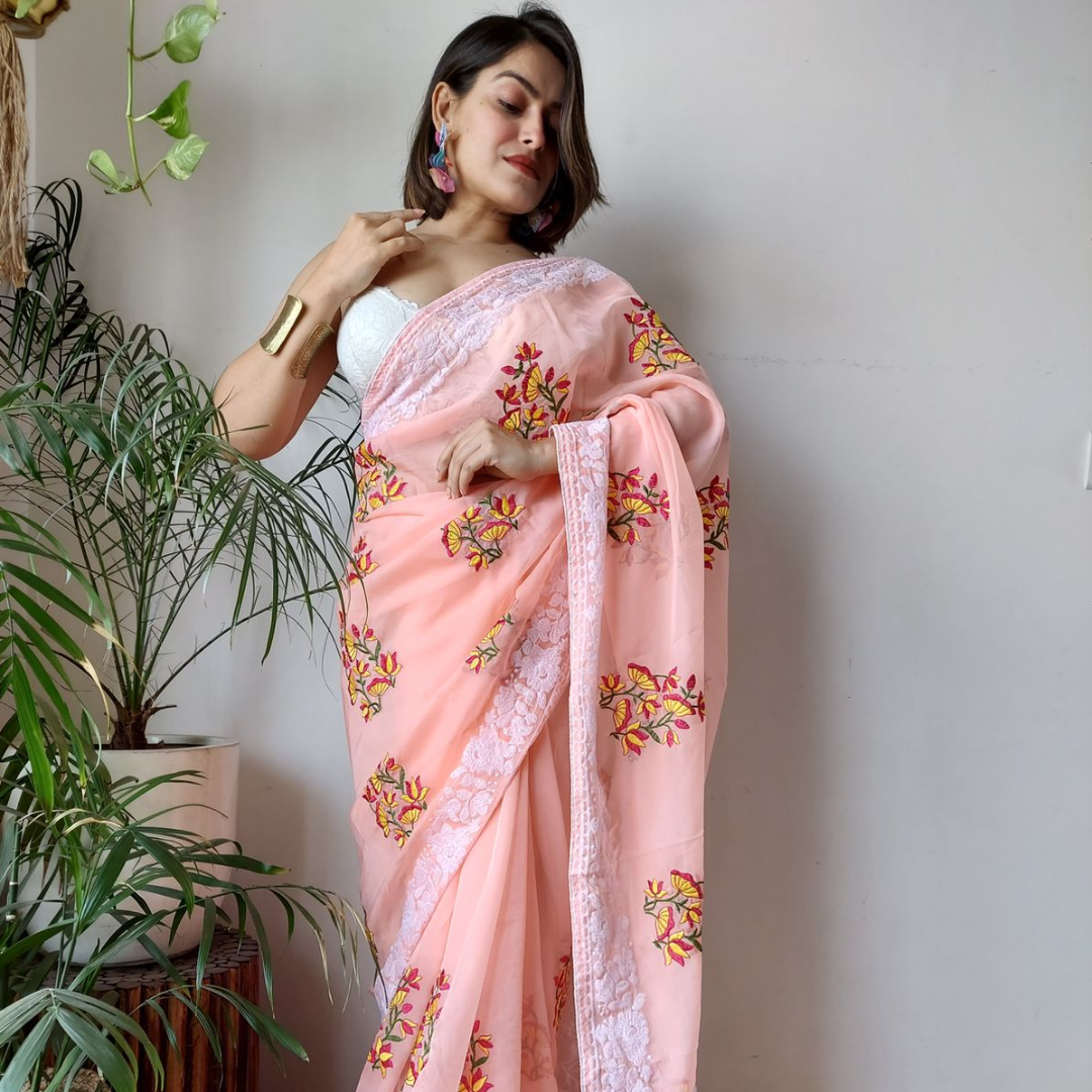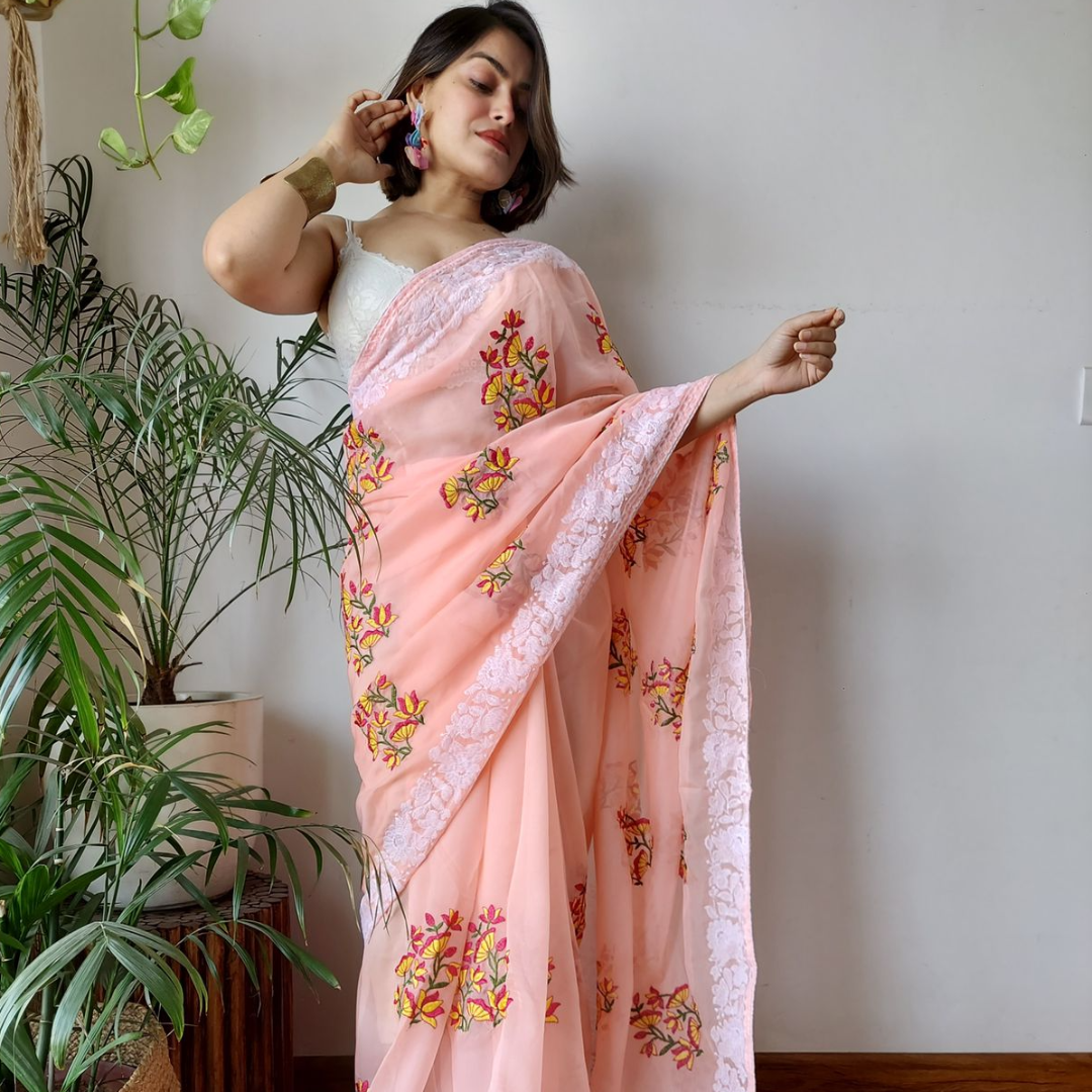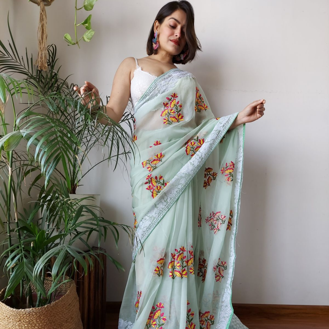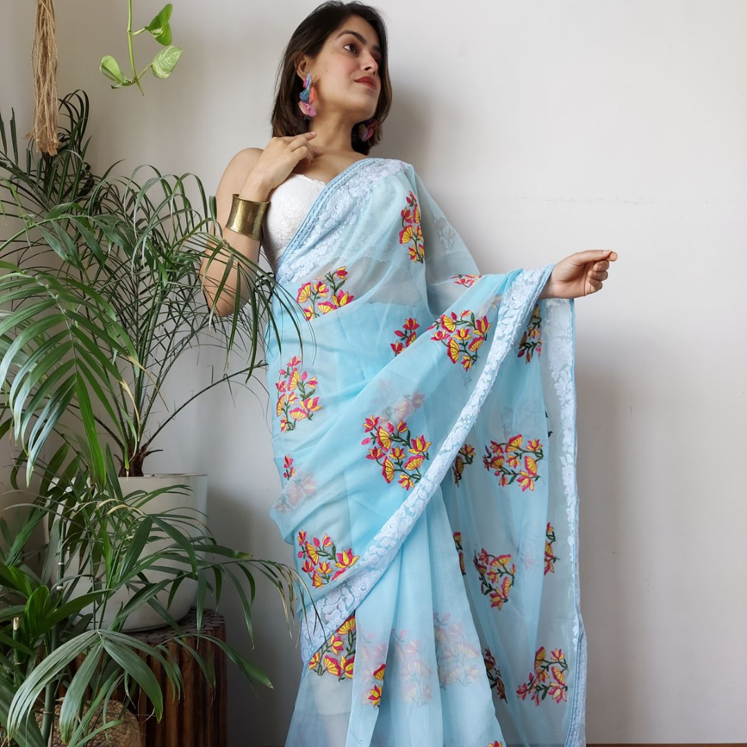 Viscose organza saree cover with beautiful viscose embroidery with tone to tone piping and white silk blouse (2)